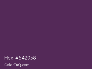 Hex #542958 Color is a dark magenta color and the nearest color is Bossanova #4e2a5a. Hex code #542958 and RGB value is rgb(84,41,88). In RGB color space, this color is composed of 33% red, 16% green, 35% blue, In CMYK color space, this color is composed of 5% cyan, 53% magenta, 0% yellow , 65% black , In HSL color space, this color has a hue angle of 295° , 36% saturation and 25% lightness.