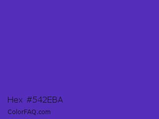 Hex #542eba Color is a normal indigo color and the nearest color is Purple Heart Crayola #652dc1. Hex code #542eba and RGB value is rgb(84,46,186). In RGB color space, this color is composed of 33% red, 18% green, 73% blue, In CMYK color space, this color is composed of 55% cyan, 75% magenta, 0% yellow , 27% black , In HSL color space, this color has a hue angle of 256° , 60% saturation and 45% lightness.