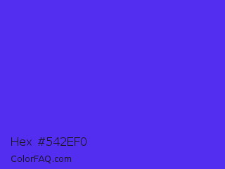 Hex #542ef0 Color is a normal indigo color and the nearest color is Han Purple #5218fa. Hex code #542ef0 and RGB value is rgb(84,46,240). In RGB color space, this color is composed of 33% red, 18% green, 94% blue, In CMYK color space, this color is composed of 65% cyan, 81% magenta, 0% yellow , 6% black , In HSL color space, this color has a hue angle of 252° , 87% saturation and 56% lightness.