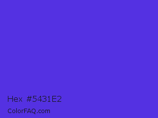 Hex #5431e2 Color is a normal indigo color and the nearest color is Majorelle Blue #6050dc. Hex code #5431e2 and RGB value is rgb(84,49,226). In RGB color space, this color is composed of 33% red, 19% green, 89% blue, In CMYK color space, this color is composed of 63% cyan, 78% magenta, 0% yellow , 11% black , In HSL color space, this color has a hue angle of 252° , 75% saturation and 54% lightness.