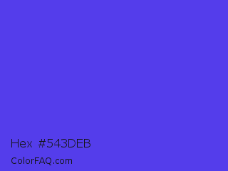 Hex #543deb Color is a normal indigo color and the nearest color is Majorelle Blue #6050dc. Hex code #543deb and RGB value is rgb(84,61,235). In RGB color space, this color is composed of 33% red, 24% green, 92% blue, In CMYK color space, this color is composed of 64% cyan, 74% magenta, 0% yellow , 8% black , In HSL color space, this color has a hue angle of 248° , 81% saturation and 58% lightness.