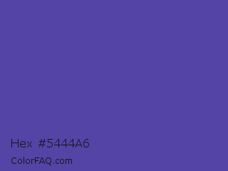 Hex #5444a6 Color is a normal indigo color and the nearest color is Plump Purple #5946b2. Hex code #5444a6 and RGB value is rgb(84,68,166). In RGB color space, this color is composed of 33% red, 27% green, 65% blue, In CMYK color space, this color is composed of 49% cyan, 59% magenta, 0% yellow , 35% black , In HSL color space, this color has a hue angle of 250° , 42% saturation and 46% lightness.