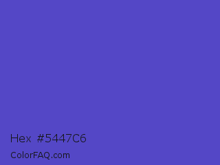 Hex #5447c6 Color is a normal indigo color and the nearest color is Iris #5a4fcf. Hex code #5447c6 and RGB value is rgb(84,71,198). In RGB color space, this color is composed of 33% red, 28% green, 78% blue, In CMYK color space, this color is composed of 58% cyan, 64% magenta, 0% yellow , 22% black , In HSL color space, this color has a hue angle of 246° , 53% saturation and 53% lightness.