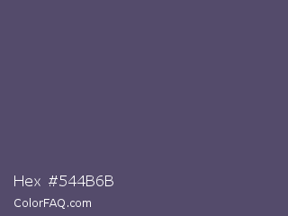 Hex #544b6b Color is a normal indigo color and the nearest color is Independence #4c516d. Hex code #544b6b and RGB value is rgb(84,75,107). In RGB color space, this color is composed of 33% red, 29% green, 42% blue, In CMYK color space, this color is composed of 21% cyan, 30% magenta, 0% yellow , 58% black , In HSL color space, this color has a hue angle of 257° , 18% saturation and 36% lightness.