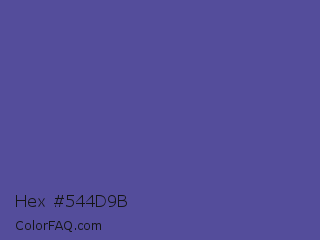 Hex #544d9b Color is a normal indigo color and the nearest color is Victoria #534491. Hex code #544d9b and RGB value is rgb(84,77,155). In RGB color space, this color is composed of 33% red, 30% green, 61% blue, In CMYK color space, this color is composed of 46% cyan, 50% magenta, 0% yellow , 39% black , In HSL color space, this color has a hue angle of 245° , 34% saturation and 45% lightness.