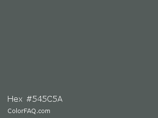 Hex #545c5a Color is a normal cyan color and the nearest color is Davys Grey #555555. Hex code #545c5a and RGB value is rgb(84,92,90). In RGB color space, this color is composed of 33% red, 36% green, 35% blue, In CMYK color space, this color is composed of 9% cyan, 0% magenta, 2% yellow , 64% black , In HSL color space, this color has a hue angle of 165° , 5% saturation and 35% lightness.