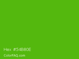 Hex #54b80e Color is a normal green color and the nearest color is Kelly Green #4cbb17. Hex code #54b80e and RGB value is rgb(84,184,14). In RGB color space, this color is composed of 33% red, 72% green, 5% blue, In CMYK color space, this color is composed of 54% cyan, 0% magenta, 92% yellow , 28% black , In HSL color space, this color has a hue angle of 95° , 86% saturation and 39% lightness.