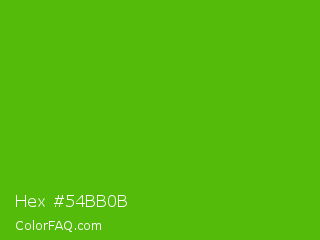 Hex #54bb0b Color is a normal green color and the nearest color is Kelly Green #4cbb17. Hex code #54bb0b and RGB value is rgb(84,187,11). In RGB color space, this color is composed of 33% red, 73% green, 4% blue, In CMYK color space, this color is composed of 55% cyan, 0% magenta, 94% yellow , 27% black , In HSL color space, this color has a hue angle of 95° , 89% saturation and 39% lightness.