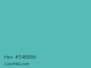 Hex #54bbb6 Color is a normal cyan color and the nearest color is Fountain Blue #56b4be. Hex code #54bbb6 and RGB value is rgb(84,187,182). In RGB color space, this color is composed of 33% red, 73% green, 71% blue, In CMYK color space, this color is composed of 55% cyan, 0% magenta, 3% yellow , 27% black , In HSL color space, this color has a hue angle of 177° , 43% saturation and 53% lightness.