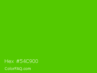 Hex #54c900 Color is a normal green color and the nearest color is Harlequin Green #46cb18. Hex code #54c900 and RGB value is rgb(84,201,0). In RGB color space, this color is composed of 33% red, 79% green, 0% blue, In CMYK color space, this color is composed of 58% cyan, 0% magenta, 100% yellow , 21% black , In HSL color space, this color has a hue angle of 95° , 100% saturation and 39% lightness.