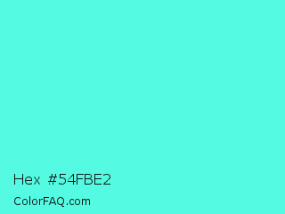 Hex #54fbe2 Color is a light cyan color and the nearest color is Turquoise #40e0d0. Hex code #54fbe2 and RGB value is rgb(84,251,226). In RGB color space, this color is composed of 33% red, 98% green, 89% blue, In CMYK color space, this color is composed of 67% cyan, 0% magenta, 10% yellow , 2% black , In HSL color space, this color has a hue angle of 171° , 95% saturation and 66% lightness.