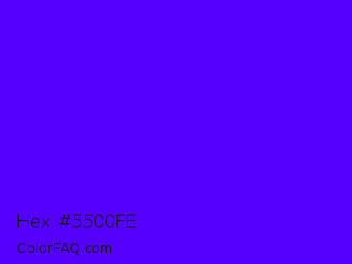 Hex #5500fe Color is a normal indigo color and the nearest color is Electric Ultramarine #3f00ff. Hex code #5500fe and RGB value is rgb(85,0,254). In RGB color space, this color is composed of 33% red, 0% green, 100% blue, In CMYK color space, this color is composed of 67% cyan, 100% magenta, 0% yellow , 0% black , In HSL color space, this color has a hue angle of 260° , 100% saturation and 50% lightness.