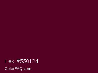 Hex #550124 Color is a very dark rose color and the nearest color is Castro #52001f. Hex code #550124 and RGB value is rgb(85,1,36). In RGB color space, this color is composed of 33% red, 0% green, 14% blue, In CMYK color space, this color is composed of 0% cyan, 99% magenta, 58% yellow , 67% black , In HSL color space, this color has a hue angle of 335° , 98% saturation and 17% lightness.