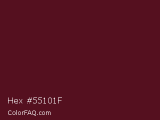 Hex #55101f Color is a very dark red color and the nearest color is Maroon Oak #520c17. Hex code #55101f and RGB value is rgb(85,16,31). In RGB color space, this color is composed of 33% red, 6% green, 12% blue, In CMYK color space, this color is composed of 0% cyan, 81% magenta, 64% yellow , 67% black , In HSL color space, this color has a hue angle of 347° , 68% saturation and 20% lightness.
