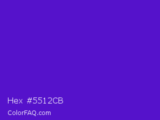 Hex #5512cb Color is a normal violet color and the nearest color is Interdimensional Blue #360ccc. Hex code #5512cb and RGB value is rgb(85,18,203). In RGB color space, this color is composed of 33% red, 7% green, 80% blue, In CMYK color space, this color is composed of 58% cyan, 91% magenta, 0% yellow , 20% black , In HSL color space, this color has a hue angle of 262° , 84% saturation and 43% lightness.