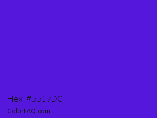 Hex #5517dc Color is a normal indigo color and the nearest color is Han Purple #5218fa. Hex code #5517dc and RGB value is rgb(85,23,220). In RGB color space, this color is composed of 33% red, 9% green, 86% blue, In CMYK color space, this color is composed of 61% cyan, 90% magenta, 0% yellow , 14% black , In HSL color space, this color has a hue angle of 259° , 81% saturation and 48% lightness.
