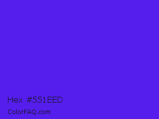 Hex #551eed Color is a normal indigo color and the nearest color is Han Purple #5218fa. Hex code #551eed and RGB value is rgb(85,30,237). In RGB color space, this color is composed of 33% red, 12% green, 93% blue, In CMYK color space, this color is composed of 64% cyan, 87% magenta, 0% yellow , 7% black , In HSL color space, this color has a hue angle of 256° , 85% saturation and 52% lightness.