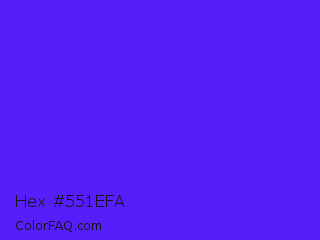 Hex #551efa Color is a normal indigo color and the nearest color is Han Purple #5218fa. Hex code #551efa and RGB value is rgb(85,30,250). In RGB color space, this color is composed of 33% red, 12% green, 98% blue, In CMYK color space, this color is composed of 66% cyan, 88% magenta, 0% yellow , 2% black , In HSL color space, this color has a hue angle of 255° , 96% saturation and 55% lightness.