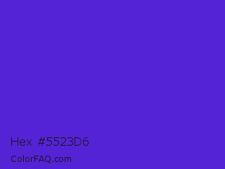 Hex #5523d6 Color is a normal indigo color and the nearest color is Purple Heart Crayola #652dc1. Hex code #5523d6 and RGB value is rgb(85,35,214). In RGB color space, this color is composed of 33% red, 14% green, 84% blue, In CMYK color space, this color is composed of 60% cyan, 84% magenta, 0% yellow , 16% black , In HSL color space, this color has a hue angle of 257° , 72% saturation and 49% lightness.