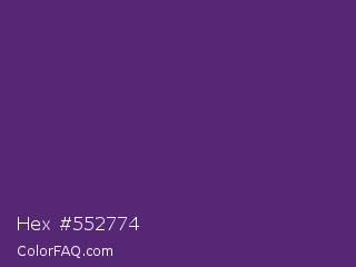 Hex #552774 Color is a dark purple color and the nearest color is Honey Flower #4f1c70. Hex code #552774 and RGB value is rgb(85,39,116). In RGB color space, this color is composed of 33% red, 15% green, 45% blue, In CMYK color space, this color is composed of 27% cyan, 66% magenta, 0% yellow , 55% black , In HSL color space, this color has a hue angle of 276° , 50% saturation and 30% lightness.