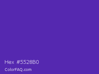 Hex #5528b0 Color is a normal indigo color and the nearest color is Purple Heart Crayola #652dc1. Hex code #5528b0 and RGB value is rgb(85,40,176). In RGB color space, this color is composed of 33% red, 16% green, 69% blue, In CMYK color space, this color is composed of 52% cyan, 77% magenta, 0% yellow , 31% black , In HSL color space, this color has a hue angle of 260° , 63% saturation and 42% lightness.