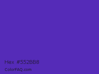 Hex #552bb8 Color is a normal indigo color and the nearest color is Purple Heart Crayola #652dc1. Hex code #552bb8 and RGB value is rgb(85,43,184). In RGB color space, this color is composed of 33% red, 17% green, 72% blue, In CMYK color space, this color is composed of 54% cyan, 77% magenta, 0% yellow , 28% black , In HSL color space, this color has a hue angle of 258° , 62% saturation and 45% lightness.