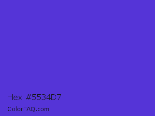 Hex #5534d7 Color is a normal indigo color and the nearest color is Purple Heart Crayola #652dc1. Hex code #5534d7 and RGB value is rgb(85,52,215). In RGB color space, this color is composed of 33% red, 20% green, 84% blue, In CMYK color space, this color is composed of 60% cyan, 76% magenta, 0% yellow , 16% black , In HSL color space, this color has a hue angle of 252° , 67% saturation and 52% lightness.