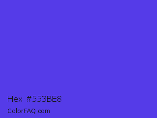 Hex #553be8 Color is a normal indigo color and the nearest color is Majorelle Blue #6050dc. Hex code #553be8 and RGB value is rgb(85,59,232). In RGB color space, this color is composed of 33% red, 23% green, 91% blue, In CMYK color space, this color is composed of 63% cyan, 75% magenta, 0% yellow , 9% black , In HSL color space, this color has a hue angle of 249° , 79% saturation and 57% lightness.