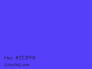 Hex #553ff8 Color is a light indigo color and the nearest color is Majorelle Blue #6050dc. Hex code #553ff8 and RGB value is rgb(85,63,248). In RGB color space, this color is composed of 33% red, 25% green, 97% blue, In CMYK color space, this color is composed of 66% cyan, 75% magenta, 0% yellow , 3% black , In HSL color space, this color has a hue angle of 247° , 93% saturation and 61% lightness.