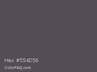 Hex #554d56 Color is a normal magenta color and the nearest color is Dark Liver #534b4f. Hex code #554d56 and RGB value is rgb(85,77,86). In RGB color space, this color is composed of 33% red, 30% green, 34% blue, In CMYK color space, this color is composed of 1% cyan, 10% magenta, 0% yellow , 66% black , In HSL color space, this color has a hue angle of 293° , 6% saturation and 32% lightness.