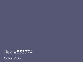 Hex #555774 Color is a normal blue color and the nearest color is Comet #5c5d75. Hex code #555774 and RGB value is rgb(85,87,116). In RGB color space, this color is composed of 33% red, 34% green, 45% blue, In CMYK color space, this color is composed of 27% cyan, 25% magenta, 0% yellow , 55% black , In HSL color space, this color has a hue angle of 236° , 15% saturation and 39% lightness.