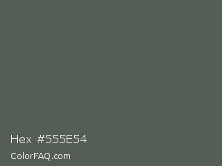 Hex #555e54 Color is a normal green color and the nearest color is Ebony #555d50. Hex code #555e54 and RGB value is rgb(85,94,84). In RGB color space, this color is composed of 33% red, 37% green, 33% blue, In CMYK color space, this color is composed of 10% cyan, 0% magenta, 11% yellow , 63% black , In HSL color space, this color has a hue angle of 114° , 6% saturation and 35% lightness.