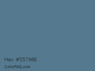 Hex #55798e Color is a normal blue color and the nearest color is Smalt Blue #51808f. Hex code #55798e and RGB value is rgb(85,121,142). In RGB color space, this color is composed of 33% red, 47% green, 56% blue, In CMYK color space, this color is composed of 40% cyan, 15% magenta, 0% yellow , 44% black , In HSL color space, this color has a hue angle of 202° , 25% saturation and 45% lightness.