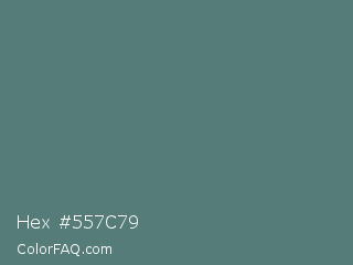 Hex #557c79 Color is a normal cyan color and the nearest color is Cutty Sark #507672. Hex code #557c79 and RGB value is rgb(85,124,121). In RGB color space, this color is composed of 33% red, 49% green, 47% blue, In CMYK color space, this color is composed of 31% cyan, 0% magenta, 2% yellow , 51% black , In HSL color space, this color has a hue angle of 175° , 19% saturation and 41% lightness.