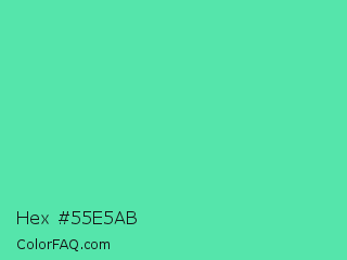 Hex #55e5ab Color is a light green color and the nearest color is Medium Aquamarine #66ddaa. Hex code #55e5ab and RGB value is rgb(85,229,171). In RGB color space, this color is composed of 33% red, 90% green, 67% blue, In CMYK color space, this color is composed of 63% cyan, 0% magenta, 25% yellow , 10% black , In HSL color space, this color has a hue angle of 156° , 73% saturation and 62% lightness.