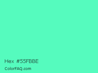 Hex #55fbbe Color is a light green color and the nearest color is Turquoise #40e0d0. Hex code #55fbbe and RGB value is rgb(85,251,190). In RGB color space, this color is composed of 33% red, 98% green, 75% blue, In CMYK color space, this color is composed of 66% cyan, 0% magenta, 24% yellow , 2% black , In HSL color space, this color has a hue angle of 158° , 95% saturation and 66% lightness.