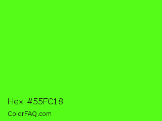 Hex #55fc18 Color is a normal green color and the nearest color is Chlorophyll Green #4aff00. Hex code #55fc18 and RGB value is rgb(85,252,24). In RGB color space, this color is composed of 33% red, 99% green, 9% blue, In CMYK color space, this color is composed of 66% cyan, 0% magenta, 90% yellow , 1% black , In HSL color space, this color has a hue angle of 104° , 97% saturation and 54% lightness.