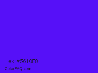 Hex #5610f8 Color is a normal indigo color and the nearest color is Han Purple #5218fa. Hex code #5610f8 and RGB value is rgb(86,16,248). In RGB color space, this color is composed of 34% red, 6% green, 97% blue, In CMYK color space, this color is composed of 65% cyan, 94% magenta, 0% yellow , 3% black , In HSL color space, this color has a hue angle of 258° , 94% saturation and 52% lightness.