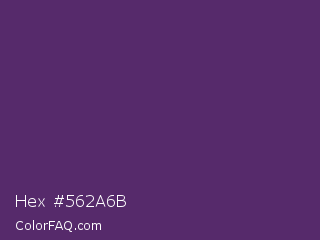 Hex #562a6b Color is a dark purple color and the nearest color is Imperial #602f6b. Hex code #562a6b and RGB value is rgb(86,42,107). In RGB color space, this color is composed of 34% red, 16% green, 42% blue, In CMYK color space, this color is composed of 20% cyan, 61% magenta, 0% yellow , 58% black , In HSL color space, this color has a hue angle of 281° , 44% saturation and 29% lightness.