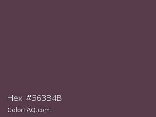 Hex #563b4b Color is a dark magenta color and the nearest color is Purple Taupe #50404d. Hex code #563b4b and RGB value is rgb(86,59,75). In RGB color space, this color is composed of 34% red, 23% green, 29% blue, In CMYK color space, this color is composed of 0% cyan, 31% magenta, 13% yellow , 66% black , In HSL color space, this color has a hue angle of 324° , 19% saturation and 28% lightness.