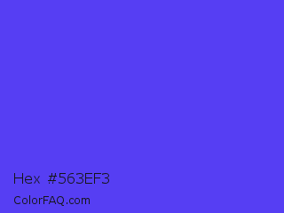 Hex #563ef3 Color is a normal indigo color and the nearest color is Majorelle Blue #6050dc. Hex code #563ef3 and RGB value is rgb(86,62,243). In RGB color space, this color is composed of 34% red, 24% green, 95% blue, In CMYK color space, this color is composed of 65% cyan, 74% magenta, 0% yellow , 5% black , In HSL color space, this color has a hue angle of 248° , 88% saturation and 60% lightness.