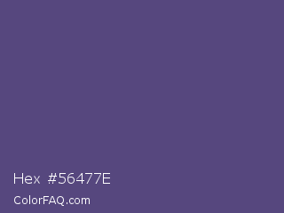 Hex #56477e Color is a normal indigo color and the nearest color is Cyber Grape #58427c. Hex code #56477e and RGB value is rgb(86,71,126). In RGB color space, this color is composed of 34% red, 28% green, 49% blue, In CMYK color space, this color is composed of 32% cyan, 44% magenta, 0% yellow , 51% black , In HSL color space, this color has a hue angle of 256° , 28% saturation and 39% lightness.