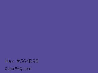 Hex #564b98 Color is a normal indigo color and the nearest color is Victoria #534491. Hex code #564b98 and RGB value is rgb(86,75,152). In RGB color space, this color is composed of 34% red, 29% green, 60% blue, In CMYK color space, this color is composed of 43% cyan, 51% magenta, 0% yellow , 40% black , In HSL color space, this color has a hue angle of 249° , 34% saturation and 45% lightness.