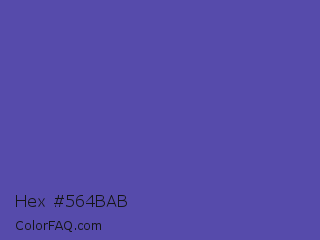 Hex #564bab Color is a normal indigo color and the nearest color is Plump Purple #5946b2. Hex code #564bab and RGB value is rgb(86,75,171). In RGB color space, this color is composed of 34% red, 29% green, 67% blue, In CMYK color space, this color is composed of 50% cyan, 56% magenta, 0% yellow , 33% black , In HSL color space, this color has a hue angle of 247° , 39% saturation and 48% lightness.