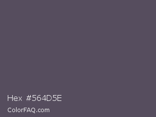 Hex #564d5e Color is a normal purple color and the nearest color is Scarpa Flow #585562. Hex code #564d5e and RGB value is rgb(86,77,94). In RGB color space, this color is composed of 34% red, 30% green, 37% blue, In CMYK color space, this color is composed of 9% cyan, 18% magenta, 0% yellow , 63% black , In HSL color space, this color has a hue angle of 272° , 10% saturation and 34% lightness.