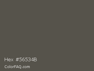 Hex #56534b Color is a normal orange color and the nearest color is Fuscous Gray #54534d. Hex code #56534b and RGB value is rgb(86,83,75). In RGB color space, this color is composed of 34% red, 33% green, 29% blue, In CMYK color space, this color is composed of 0% cyan, 3% magenta, 13% yellow , 66% black , In HSL color space, this color has a hue angle of 44° , 7% saturation and 32% lightness.