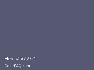Hex #565971 Color is a normal blue color and the nearest color is Comet #5c5d75. Hex code #565971 and RGB value is rgb(86,89,113). In RGB color space, this color is composed of 34% red, 35% green, 44% blue, In CMYK color space, this color is composed of 24% cyan, 21% magenta, 0% yellow , 56% black , In HSL color space, this color has a hue angle of 233° , 14% saturation and 39% lightness.