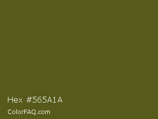 Hex #565a1a Color is a dark yellow color and the nearest color is Saratoga #555b10. Hex code #565a1a and RGB value is rgb(86,90,26). In RGB color space, this color is composed of 34% red, 35% green, 10% blue, In CMYK color space, this color is composed of 4% cyan, 0% magenta, 71% yellow , 65% black , In HSL color space, this color has a hue angle of 64° , 55% saturation and 23% lightness.