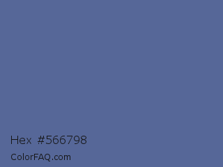 Hex #566798 Color is a normal blue color and the nearest color is UCLA Blue #536895. Hex code #566798 and RGB value is rgb(86,103,152). In RGB color space, this color is composed of 34% red, 40% green, 60% blue, In CMYK color space, this color is composed of 43% cyan, 32% magenta, 0% yellow , 40% black , In HSL color space, this color has a hue angle of 225° , 28% saturation and 47% lightness.