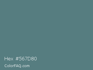 Hex #567d80 Color is a normal cyan color and the nearest color is Wintergreen Dream #56887d. Hex code #567d80 and RGB value is rgb(86,125,128). In RGB color space, this color is composed of 34% red, 49% green, 50% blue, In CMYK color space, this color is composed of 33% cyan, 2% magenta, 0% yellow , 50% black , In HSL color space, this color has a hue angle of 184° , 20% saturation and 42% lightness.